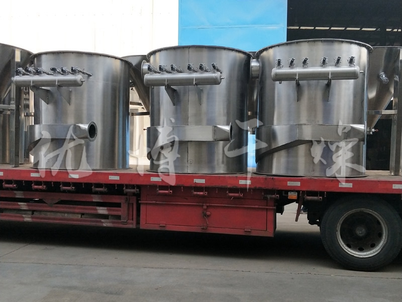 脈沖袋式除塵器主要由上箱體、中箱體、灰斗、進風均流管、支架濾袋及噴吹裝置、卸灰裝置等組成。含塵氣體從除塵器的進風均流管進入各分室灰斗,并在灰斗導流裝置的導流下,大顆粒的粉塵被分離,直接落入灰斗,而較細粉塵均勻地進入中部箱體而吸附在濾袋的外表面上,干凈氣體透過濾袋進入上箱體,并經各離線閥和排風管排入大氣。隨著過濾工況的進行,濾袋上的粉塵越積越多,當設備阻力達到限定的阻力值(一般設定為1500Pa )時,由清灰控制裝置按差壓設定值或清灰時間設定值自動關閉一室離線閥后,按設定程序打開電控脈沖閥,進行停風噴吹,利用壓縮空氣瞬間噴吹使濾袋內壓力聚增,將濾袋上的粉塵進行抖落(即使粘細粉塵亦能較徹底地清灰)至灰斗中,由排灰機構排出。