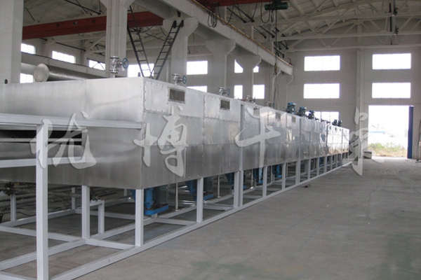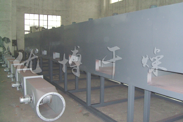 物料由加料器均勻地鋪在網帶上,網帶一般采用12-60目不銹鋼絲網,由傳動裝置拖動在干燥機內移動。干燥機由若干單元組成,每一單元熱風獨立循環,部分尾氣由專門排濕風機排出,廢氣由調節閥控制,熱氣由下往上或由上往下穿過鋪滿物料的網帶完成熱量與質量傳遞的進程,帶走物料水份。網帶緩慢移動,運行速度可根據物料溫度自由調節,干燥后的成品連續落入收料器中。上下循環單元根據用戶需要可靈活配備,單元數量亦可根據需要選取。