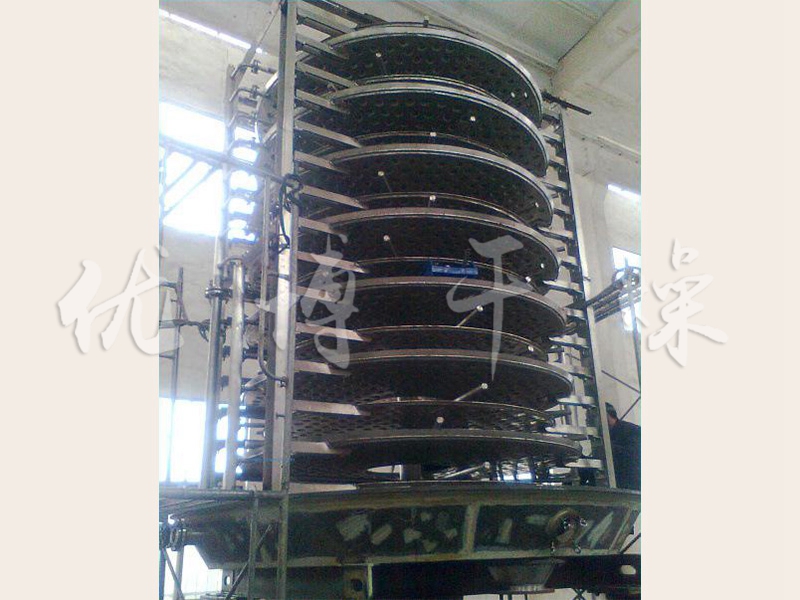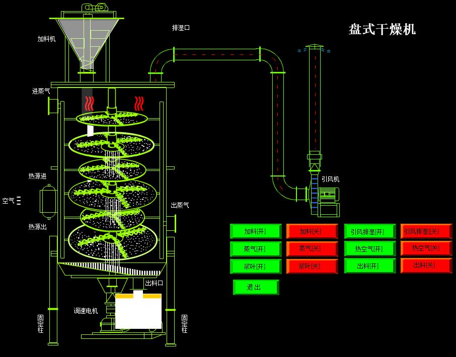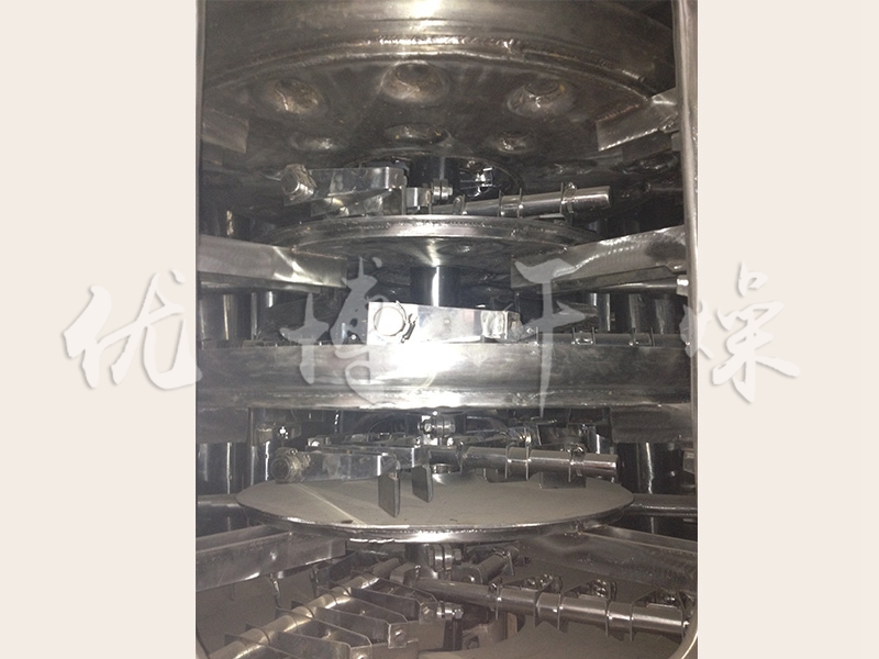 濕物料自加料器連續(xù)地加到干燥器上部一層干燥盤上,帶有耙葉的耙臂作回轉運動使耙臂作回轉運動使耙葉連續(xù)地翻抄物料。物料沿指數(shù)螺旋線流過干燥盤表面,在小干燥盤上的物料被移送到外緣,并在外緣落到下方的大干燥盤外緣,在大干盤上物料向里移動并從中間落料口落如下一層小干燥盤中。大小干燥盤上下交替排列,物料得以連續(xù)地流過整個干燥器。中空的干燥盤內(nèi)通入加熱介質,加熱介質形式有飽和蒸汽、熱水和導熱油,加熱介質由干燥盤的一端進入,從另一端導出。已干物料從后一層干燥盤落到殼體的底層,后被耙葉移送到出料口排出。濕份從物料中逸出,由設在頂蓋上的排濕口排出,真空型盤式干燥器的濕氣由設在頂蓋上的真空泵口排出。從底層排出的干物料可直接包裝。通過配加翅片加熱器、溶劑回收冷凝器、袋式除塵器、干料返混機構、引風機等輔機,可提高其干燥的生產(chǎn)能力,干燥膏糊狀和熱敏性物 料,可方便地回收溶劑,并能進行熱解和反應操作。