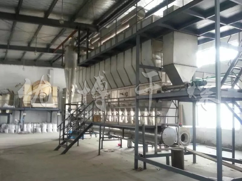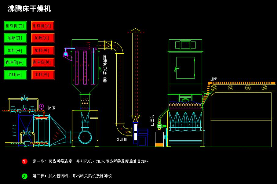 散粒狀固體物料由加料器加入流化床干燥器中,過濾后的潔凈空氣加熱后由鼓風(fēng)機(jī)送入流化床底部經(jīng)分布板與固體物料接觸,形成流態(tài)化達(dá)到氣固的熱質(zhì)交換。物料干燥后由排料口排出,廢氣由沸騰床頂部排出經(jīng)旋風(fēng)除塵器組和布袋除塵器回收固體粉料后排空。