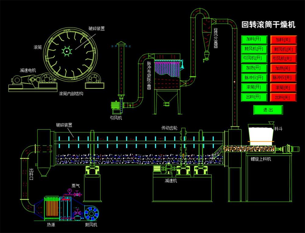濕物料從干燥機(jī)一端投入后,在內(nèi)筒均布的抄板器翻動下,物料在干燥器內(nèi)均勻分布與分散,且與并流( 逆流 )的熱空氣充分接觸 ,加快了干燥傳流、傳質(zhì)推動力。在干燥過程中,物料在帶有傾斜的抄板和熱氣流作用下,可調(diào)控地運動至干燥機(jī)另一端星形卸料閥排出成品。